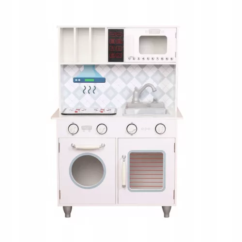 Kuchenka drewniana staje się pełnoprawnym meblem w pokoju dziecięcym. Otwierane piekarnik, mikrofalówka i pralka mogą pełnić  funkcję szafek -  są idealne do przechowywania produktów lub sprzętów kuchennych.