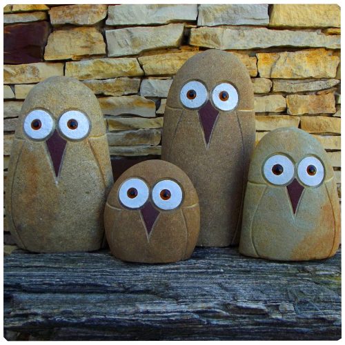 Zestaw czterech dopasowanych do siebie sów wykonanych z naturalnego kamienia. Figurki są odporne na warunki atmosferyczne, oczy sów są ze szkła,. Doskonała dekoracja do ogrodu domku czy na taras. Każdy zestaw jest troszkę inny ponieważ wykonany jest z naturalnych kamieni otoczaków.