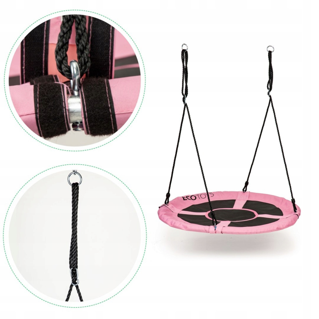• Liny huśtawki mocowane są na specjalnych śrubach, które dodatkowo łączą elementy okrągłej ramy bocianiego gniazda. Dla bezpieczeństwa dzieci, miejsca łączeń oraz śruby schowane są pod specjalnym kołnierzem zapinanym na rzep.