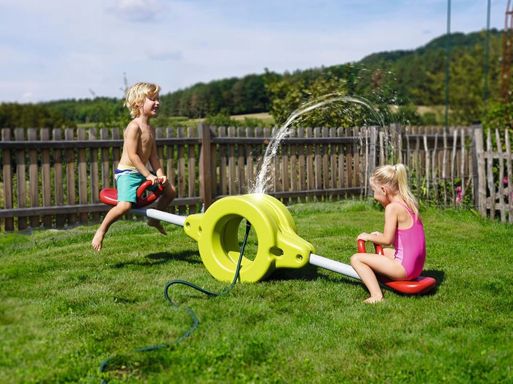 Ogrodowa huśtawka z natryskiem to propozycja dla dzieci już od 3 roku życia! Huśtawka równoważnia o długości 230cm, wykonana z wytrzymałego plastiku gwarantuje stabilność i niezawodność. Metalowe rurki łączące siedzenia z osią centralną zapewniają solidną konstrukcję. Siedziska z formowanego nadmuchowo tworzywa sztucznego wyposażone są w uchwyty, które zapewniają pewne trzymanie podczas zabawy. Dodatkowo można podłączyć wąż ogrodowy, tworząc letnią atrakcję w postaci zabawnej fontanny sprawdzi się podczas letnich upałów.