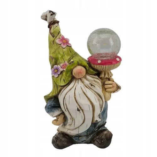 Ta ujmująca figurka krasnala trzyma w ręce muchomora z owalną kopułą z oświetleniem. Ręcznie malowany ze wspaniałymi detalami. Prawdziwe dzieło sztuki stanowi uroczy dodatek do każdego domu, ogrodu.