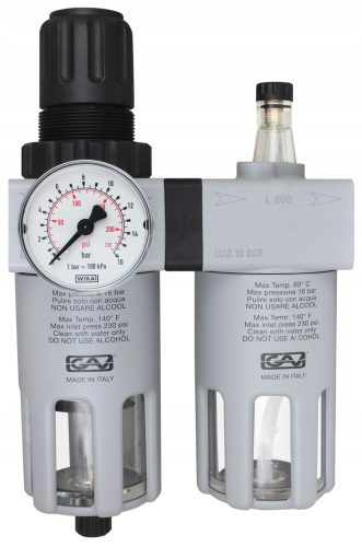 Profesjonalny sieciowy filtr z reduktorem powietrza i naolejaczem FRL-200 uznanej i cenionej włoskiej firmy GAV. Filtr przeznaczony do usuwania cząsteczek zanieczyszczeń stałych i ciekłych ze sprzężonego powietrza, wkład filtrujący o gradacji 10 µm. Odwadniacz wyposażony w ręczny spust kondensatu. Reduktor z manometrem wyposażony w pokrętło z blokadą. Smarownik smoczkowy, moduł wyposażony w uchwyty do montażu.