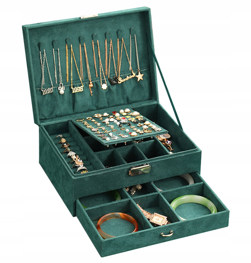 ✅ Mnogość zawieszek, pojemnych przegródek oraz wysuwana szufladka w dolnej części szkatułki zapewnią wiele miejsca na nasze błyskotki.