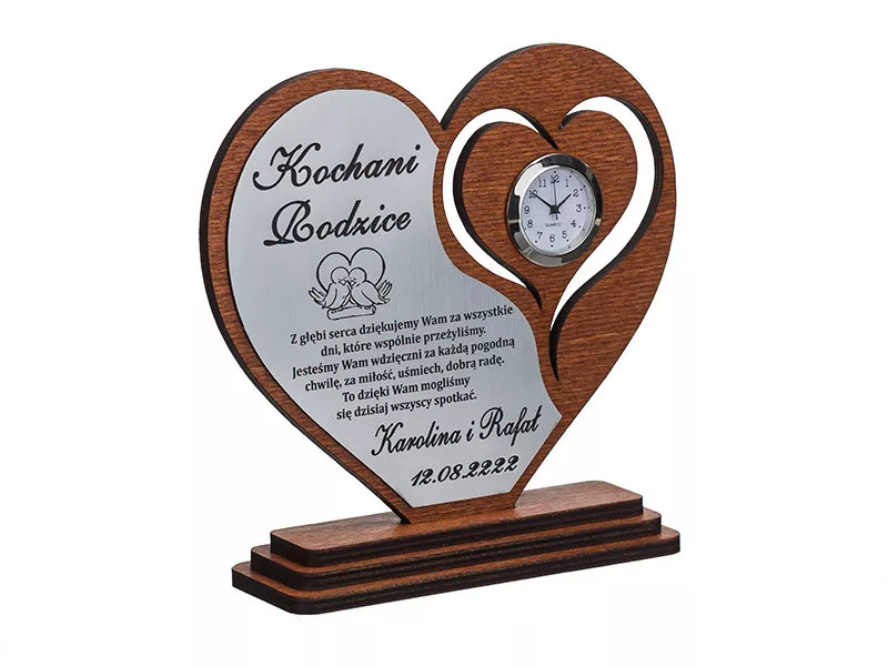 Masz problem z podjęciem decyzji jaki prezent wybrać na podziękowania dla rodziców albo rocznicę ślubu? Idziesz na rodzinną imprezę i nie wiesz co kupić jubilatowi / solenizantowi? Kup teraz tą statuetkę. Jest to piękne serce ze sklejki z grawerem bezpośrednim na specjalnym laminacie grawerskim. Została wykonana z DROGIEJ SKLEJKI O 6 MM GRUBOŚCI. Jest to nasz oryginalny pomysł na prezent dla Rodziców czy na każdą inną okazję. Dodatkowo bejcowana i lakierowana. Z boku ma prawdziwy zegarek (to nie atrapa) Obdarowana osoba widząc tak dobrze wykonany prezent na pewno będzie zachwycona!