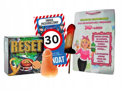 W zestawie znajdują się gra reset, gumowy penis, lizak penis, mandat urodzinowy oraz torebka prezentowa.