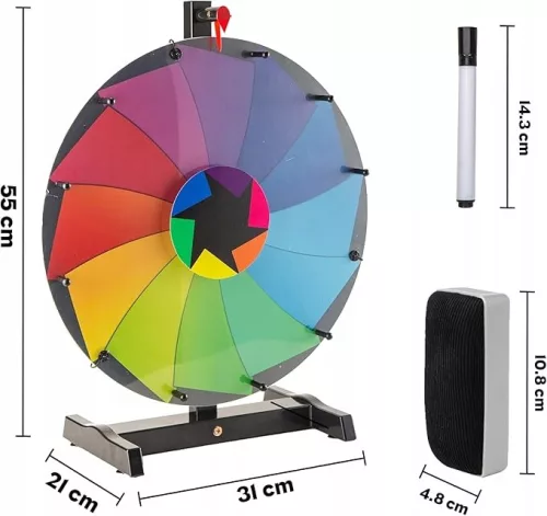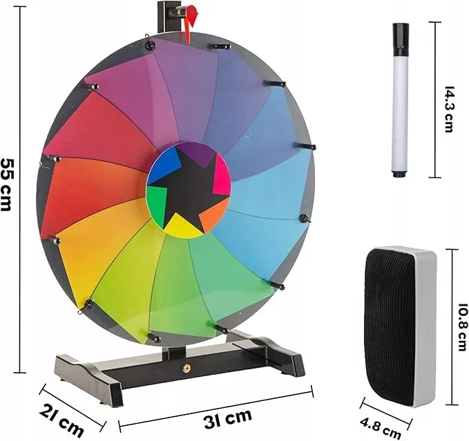 • Mocna konstrukcja: stabilny metalowy stojak utrzymuje wszystko razem, idealny na każdą okazję. Niezależnie od tego, czy na weselu, imprezie firmowej lub w domu, nasze koło szczęścia zapewni właściwy obrót.