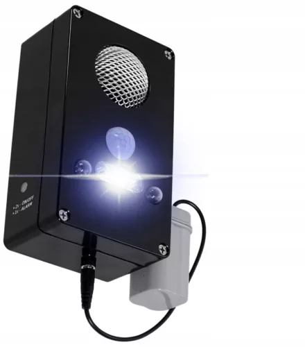 Odstraszacz emituje na zmianę bardzo silne białe i ultrafioletowe światło i ultradźwięki w zakresie 15-50kHz !