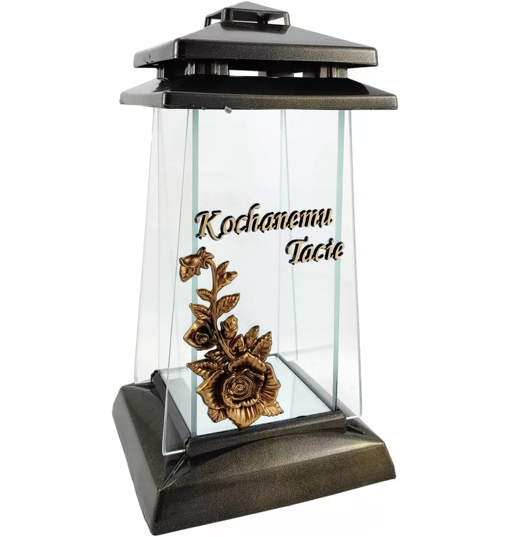 Pięknie wykonany znicz z bezbarwnego grubego szkła z napisem Kochanemu Tacie. Znicz jest ciężki, solidny, a szeroka podstawa zapewnia stabilność. Elementy plastikowe wykonane są z twardego plastiku odpornego na wysokie temperatury.