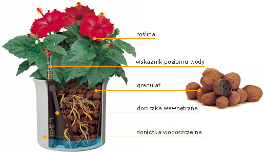 Hydroponika (hydrokultura) to alternatywny do uprawy ziemnej sposób uprawy roślin. Ziemia stosowana w uprawie tradycyjnej zastąpiona została ceramicznym, obojętnym chemicznie granulatem.System jest niezwykle prosty i łatwy do zastosowania. Wskaźnik poziomu wody dokładnie wskazuje, kiedy należy podlewać roślinę.