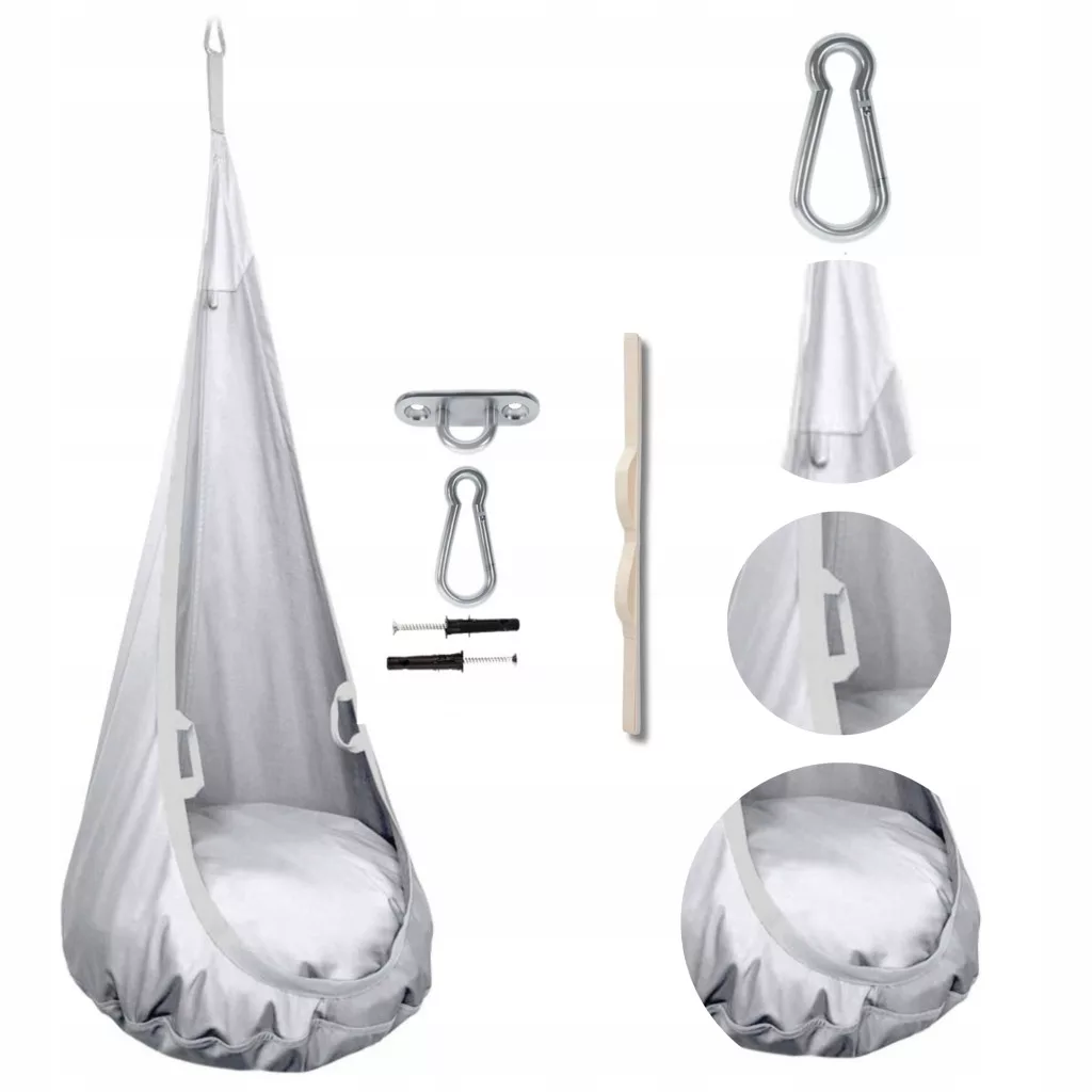 Wiszący kokon dla dzieci wykonany jest z wytrzymałego materiału odpornego na uszkodzenia i odkształcenia. Wisząca huśtawka jest wykończona podwójnymi szwami i specjalną taśmą. Kółko do zawieszania jest częścią torby, w zestawie z karabińczykiem i hakiem metalowym oraz przedłużką. Produkt spełnia rygorystyczne wymagania bezpieczeństwa.