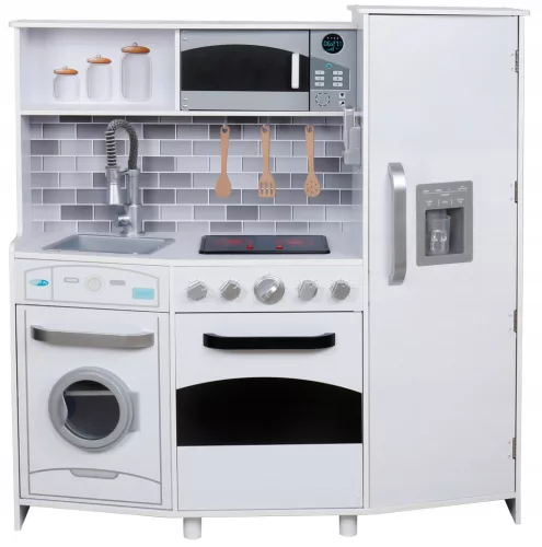 Drewniana kuchnia zabawkowa CERLO posiada modny nowoczesny wygląd, a biały kolor nadaje jej stylu i elegancji.