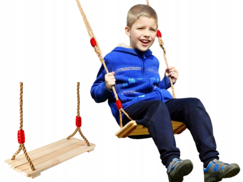 Wytrzymałe liny i metalowe, solidne elementy mocujące gwarantują bezpieczeństwo dziecka i dają pewność, że huśtawka się nie zerwie. Jasny kolor drewna jest miły dla oka, atrakcyjny i ładnie koresponduje z ciemnobrązową barwą lin.