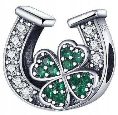 Odkryj nasz piękny srebrny charms przedstawiający podkowę i czterolistną koniczynę na szczęście, ozdobiony błyszczącymi cyrkoniami. To symbol szczęścia i dobrej fortuny, idealny jako prezent.