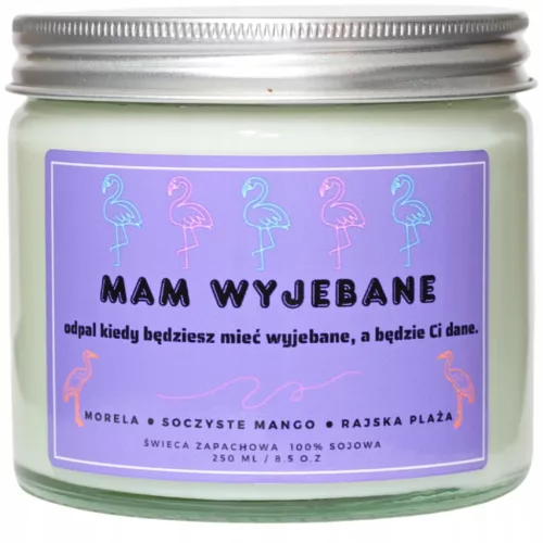 Świeczka sojowa MAM WYJEBANE - odpal kiedy będziesz mieć wyjebane, a będzie Ci dane. to nie tylko źródło cudownych aromatów, ale także towarzysz w chwilach odprężenia. Ręcznie wykonana z pasją, ta świeca łączy w sobie delikatny zapach moreli, soczystego mango i atmosferę rajskej plaży, przenosząc Cię w miejsce spokoju i ukojenia.