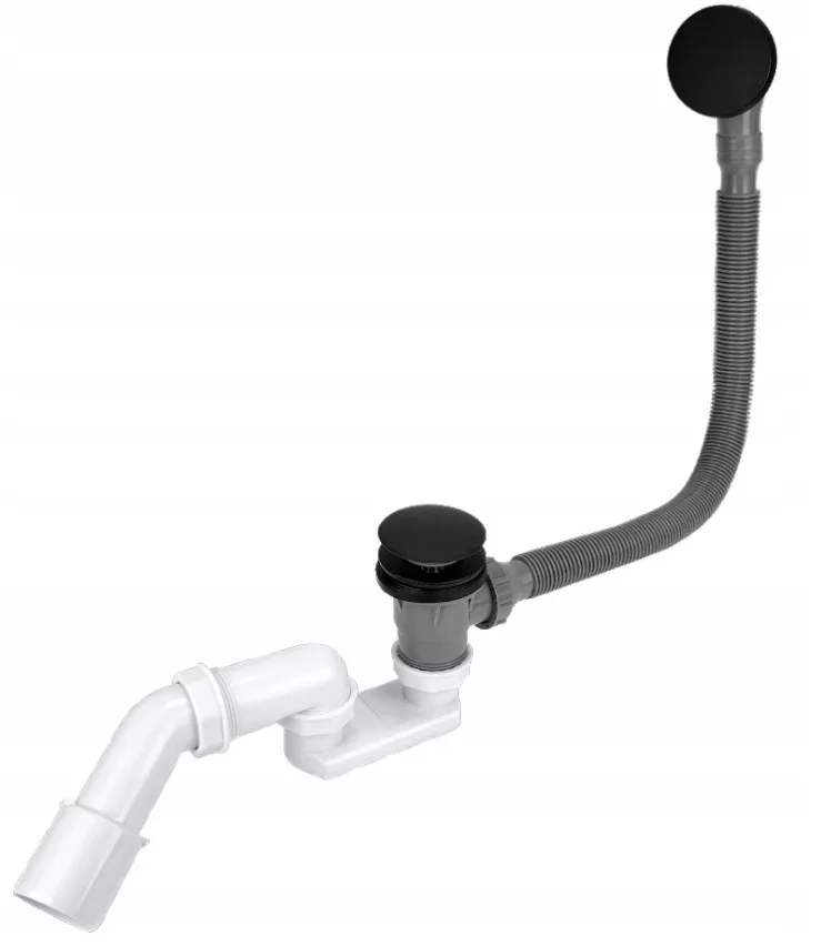 Syfon do wanny KLIK-KLAK czyszczony od góry , czarny mat korek i osłona przelewu wykonane z mosiądzu