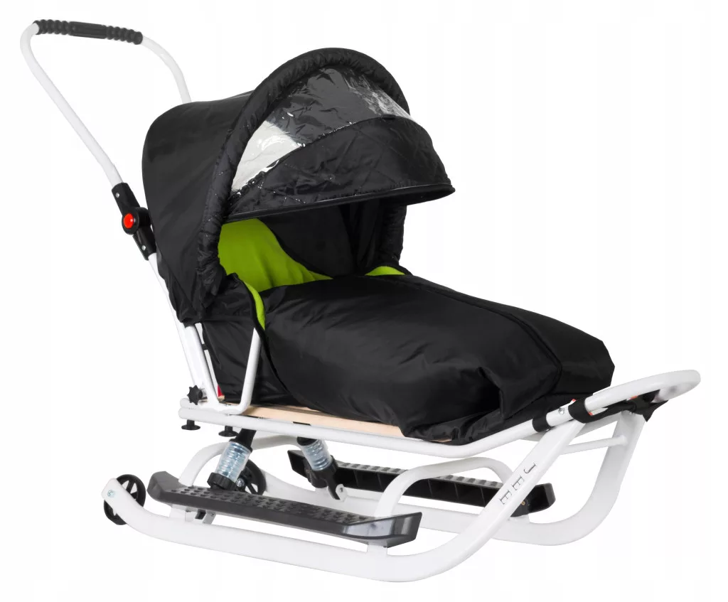 Sanki z amortyzatorami, śpiworem, budką i podnóżkami w wersji TOP.