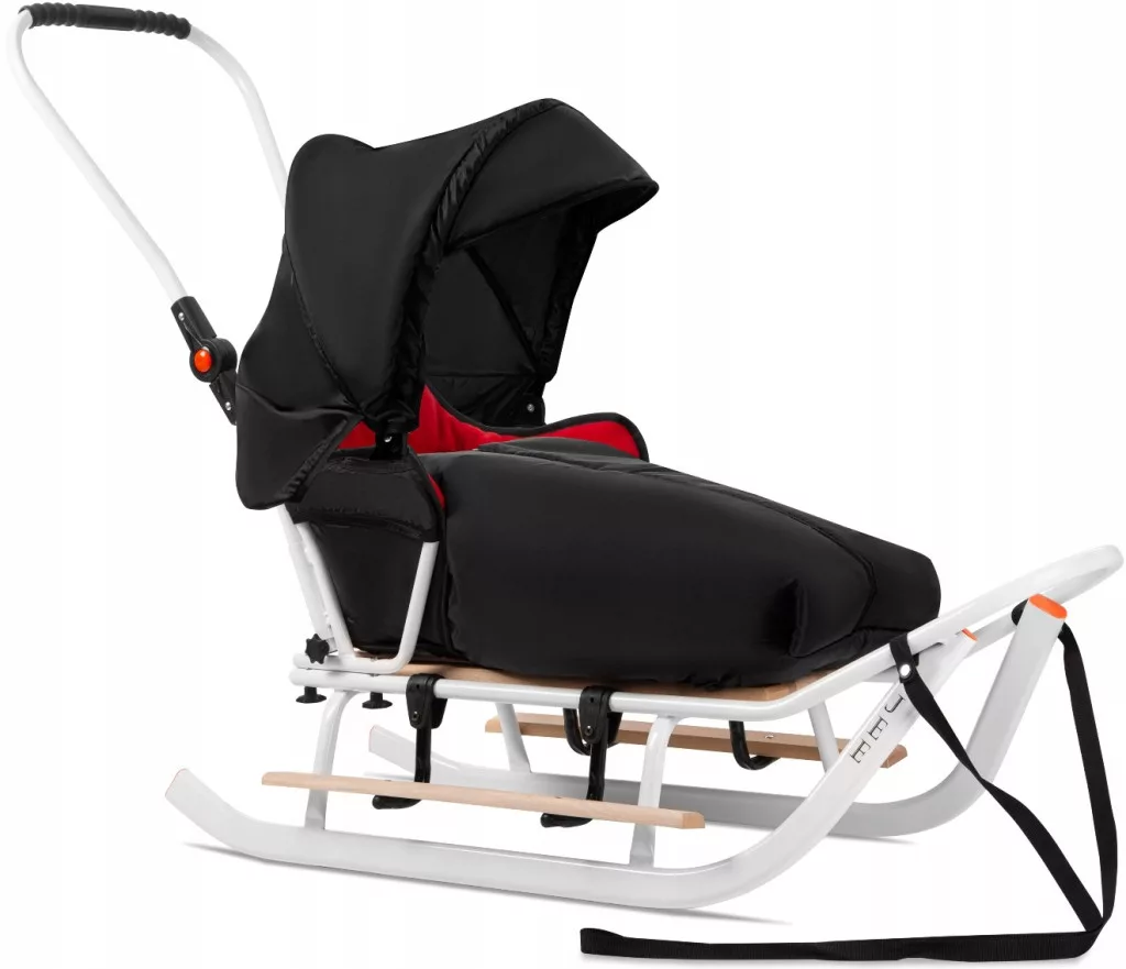 Sanki w zestawie z oparciem dokręcanym na śruby które są w komplecie,  pchaczem regulowanym (demontowalnym), podnóżkami oraz śpiworkiem