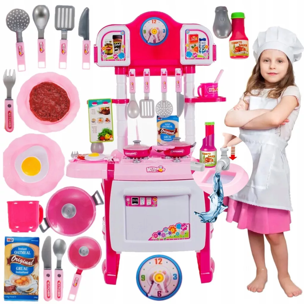Kuchnia z lejącą się wodą z kranu dla dzieci to świetny pomysł na prezent dla pociech lubiących zabawę w kucharza. To doskonały początek przygody z gotowaniem. Podczas zabawy w kąciku kuchennym dzieci uczą się zastosowania poszczególnych akcesoriów w kuchni, a także ćwiczą zdolności manualne i koordynację ruchową.