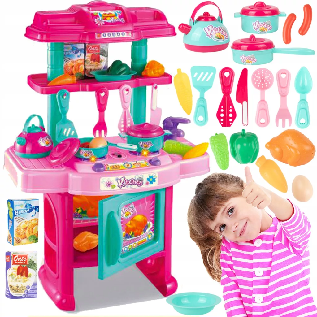 W każdej kuchni znajdują się podstawowe akcesoria i przybory niezbędne do zabawy w małego kucharza. Dodatkowo w zestawie można znaleźć imitacje artykułów spożywczych, warzyw oraz mięsa.