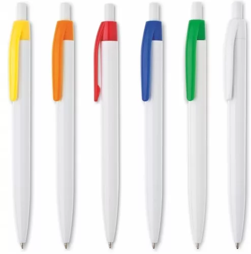 Plastikowy długopis LIDO ma białą obudowę i kolorowy klips.