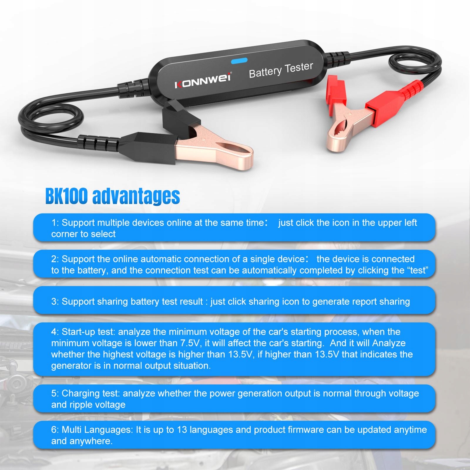 Wielojęzyczny: tester akumulatora samochodowego obsługuje 13 języków: angielski, niemiecki, francuski, japoński, koreański, holenderski, rosyjski, hiszpański, włoski, portugalski, polski, perski itp.