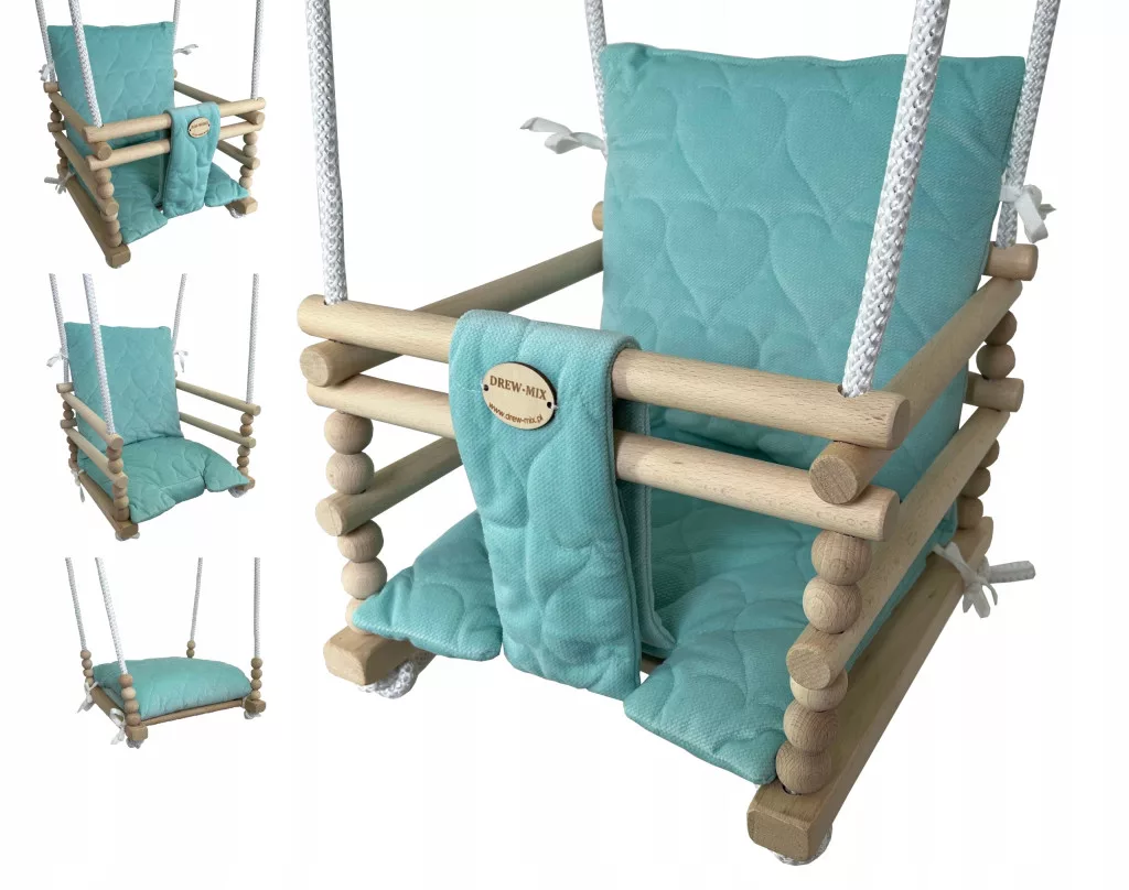 Drewniana huśtawka kubełkowa. Wykonana z certyfikowanych materiałów bezpiecznych dla dzieci. Huśtawka  posiada porządnie zamontowaną przegrodę między nóżkami, oparcie oraz zabezpieczenia boczne. Wykonana jest z drewna bukowego woskowanego.
