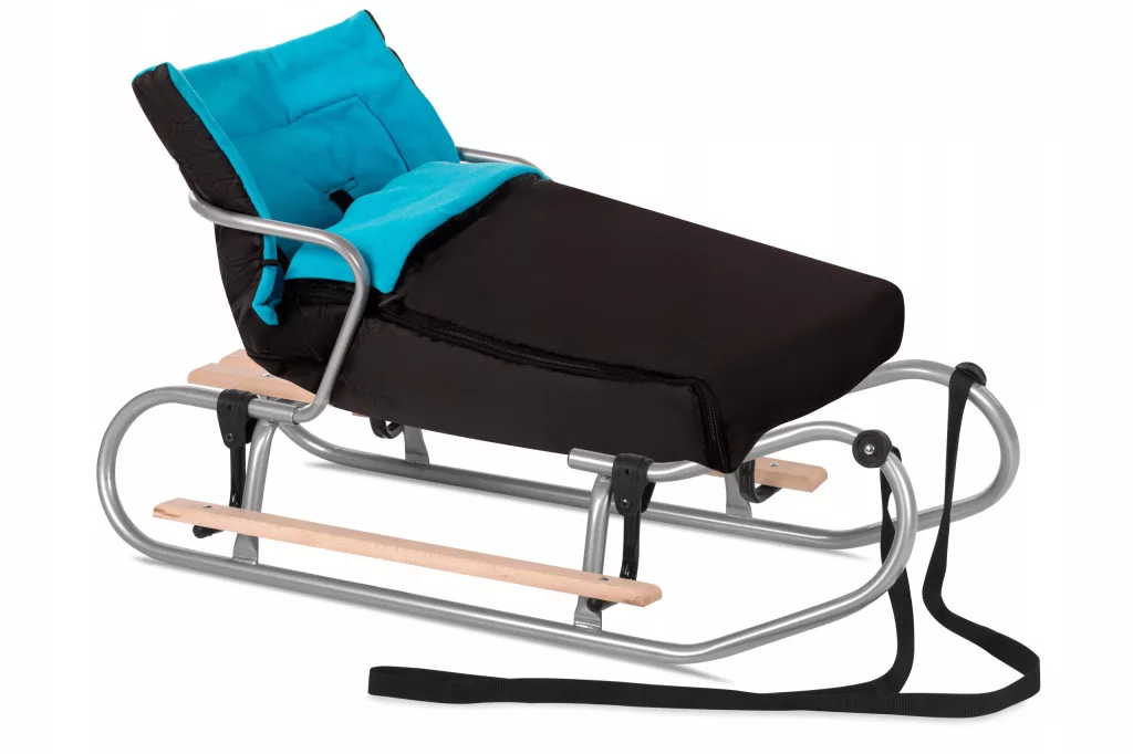 Sanki CLASSIK z oparciem, podnóżkami i śpiworkiem dla dzieci.