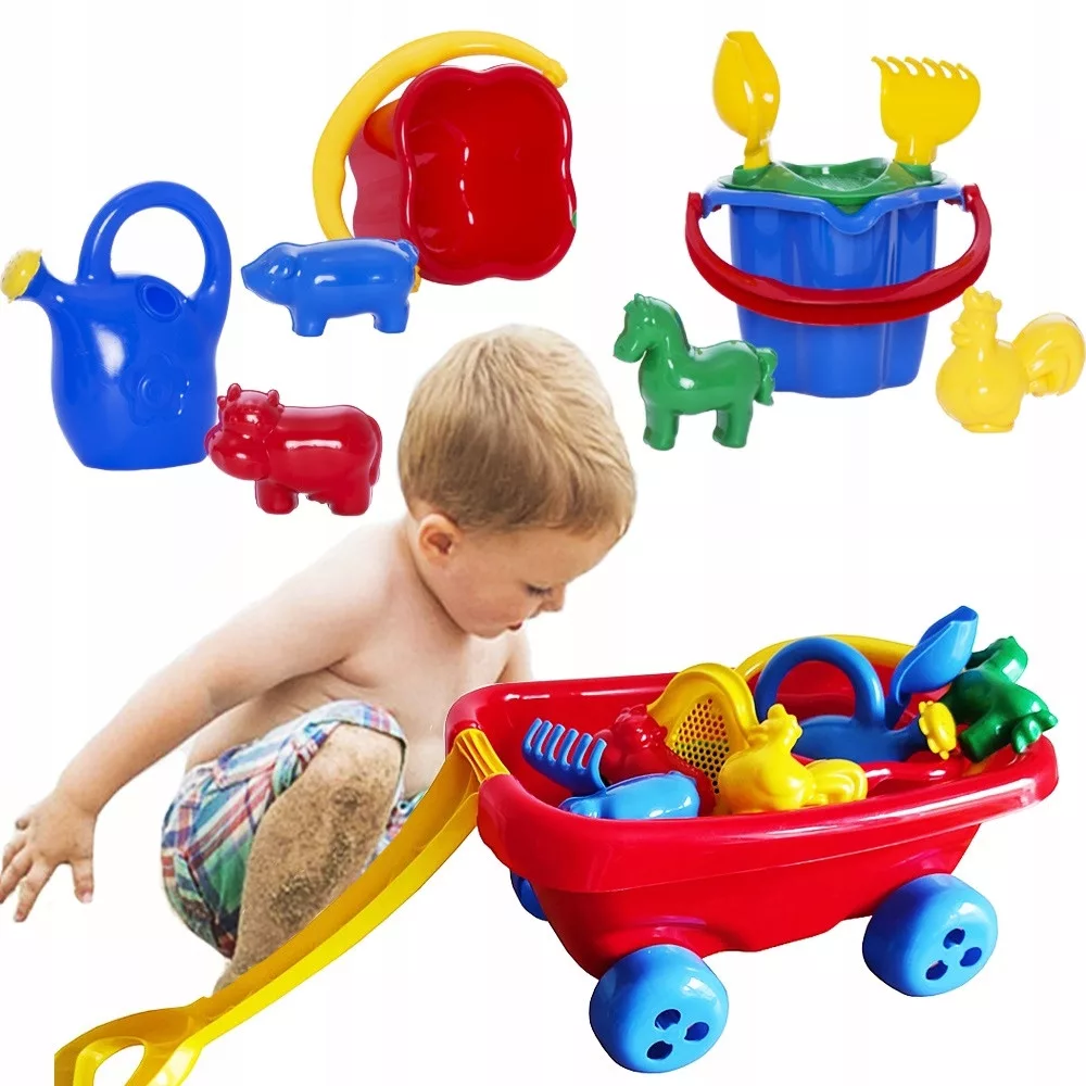 ŚLICZNY ZESTAW DLA MALUSZKA - WÓZECZEK Z RĄCZKĄ + ZESTAW DO PIASKU (2 x WIADERKO ZAMEK, KONEWKA, SITKO, ŁOPATKA, GRABKI, 4 FOREMKI)
