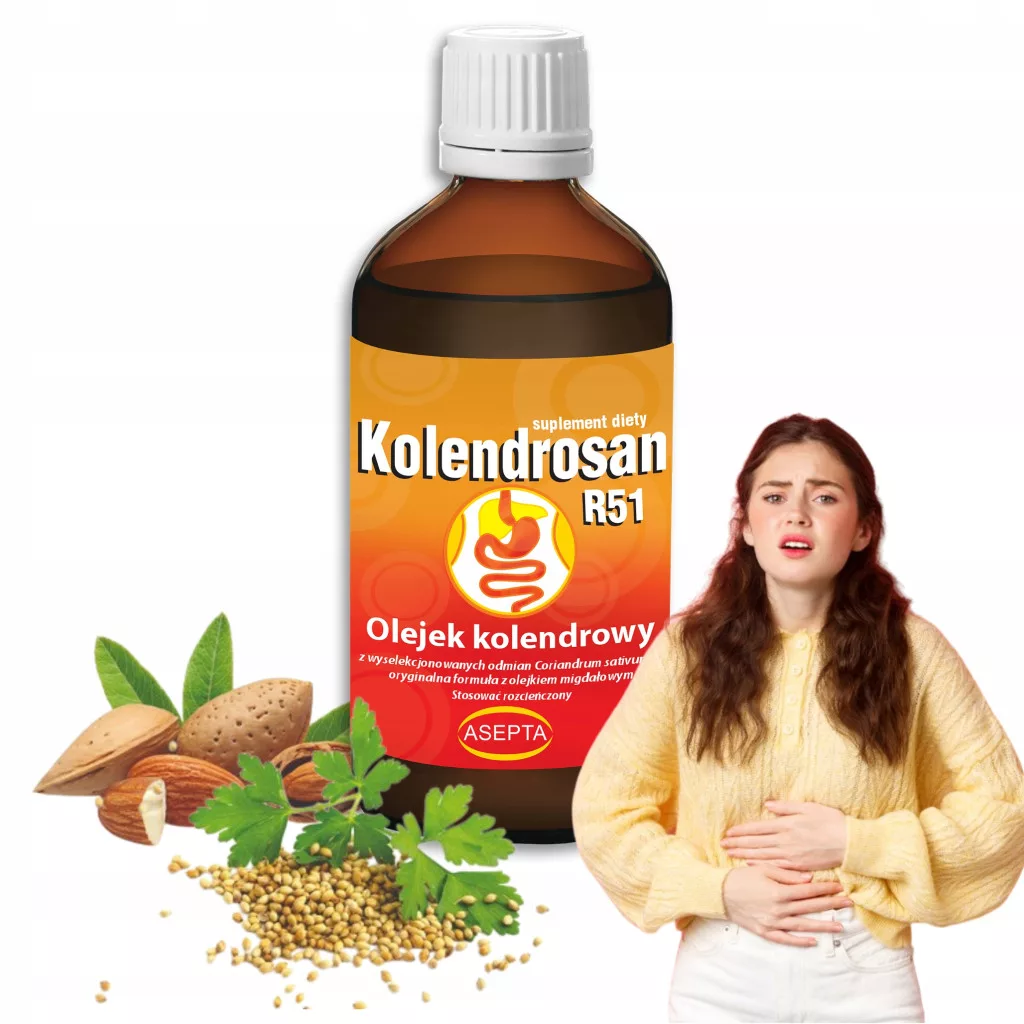 Kolendrosan R51 to połączenie olejku z nasion kolendry z olejkiem ze słodkich migdałów, korzystnie wpływających na trawienie i przyswajanie pokarmów. Formuła wytwarzana tradycyjną metodą destylacji parą wodną. Spożywanie olejków z nasion kolendry i olejku ze słodkich migdałów w postaci płynnej jest bardziej korzystne, gdyż wchłanianie ich aktywnych substancji zaczyna się już w ustach.
