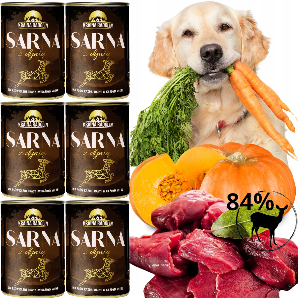 ZESTAW 6 SZTUK: Kraina Radolin Sarna z dynią 400g 84% mięsa karma mokra dla alergików z nadwrażliwością pokarmową dla wszystkich ras w każdym wieku SAMA NATURA DZICZYZNA