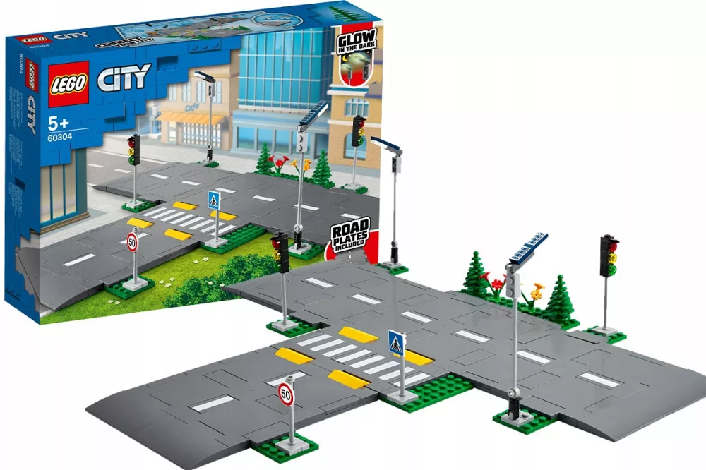 • Co jest w pudełku? Pięć płyt drogowych LEGO® z oznaczeniami pasów, progami zwalniającymi i przejściem dla pieszych, a do tego świecące w ciemności latarnie, zabawkowa sygnalizacja świetlna, znaki drogowe, drzewa i elementy zieleni.