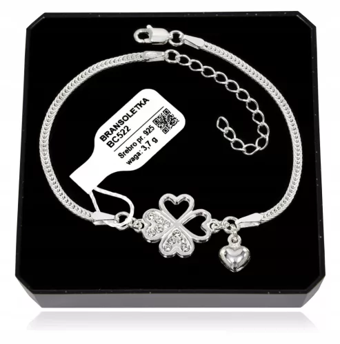 Bransoletka srebrna Koniczynka z cyrkoniami serce