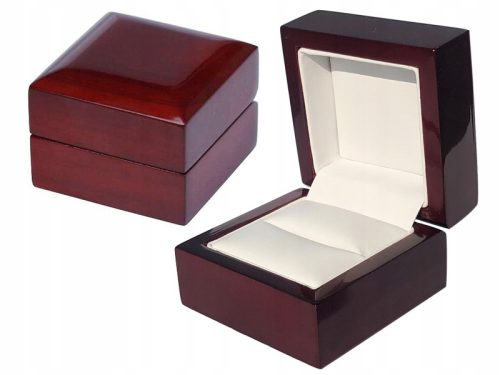 Luksusowe pudełko z drewna pokrytego transparentnym lakierem z połyskiem. W kolorze bordowym. Wkładka wykonana ze skóry ekologicznej. Pudełko zapakowane jest w białe, ochronne pudełko kartonowe.