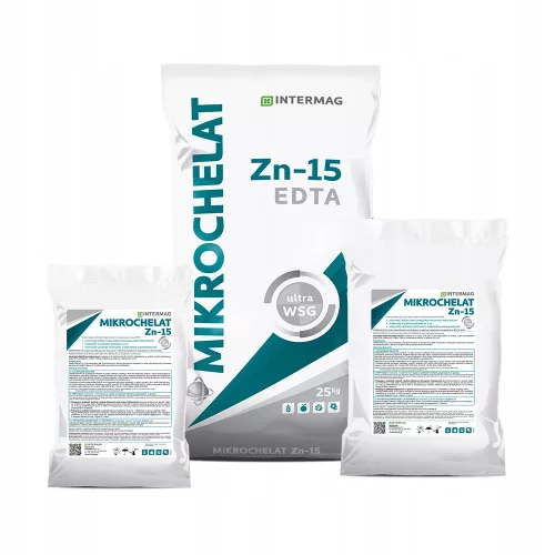 MIKROCHELAT Zn-15 zawiera 150 g Zn/kg (15%). Cynk jest w pełni schelatowany przez EDTA. Cynk (Zn) w formie chelatu jest szybciej wchłaniany, przemieszczany i przyswajany przez rośliny niż cynk dostarczany roślinom w innych formach.