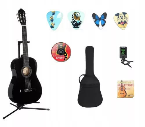Idealnie sprawdzi się na lekcje gry. Gitara zaskakuje pod względem komfortu gry. W gitarze zamontowane są struny nylonowe.