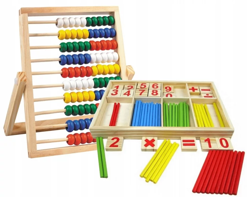 Zestaw zawiera drewniane cyferki oraz znaki równości, dodawania, odejmowania, mnożenia oraz dzielenia, znak większości oraz mniejszości oraz kolorowe patyczki do liczenia.