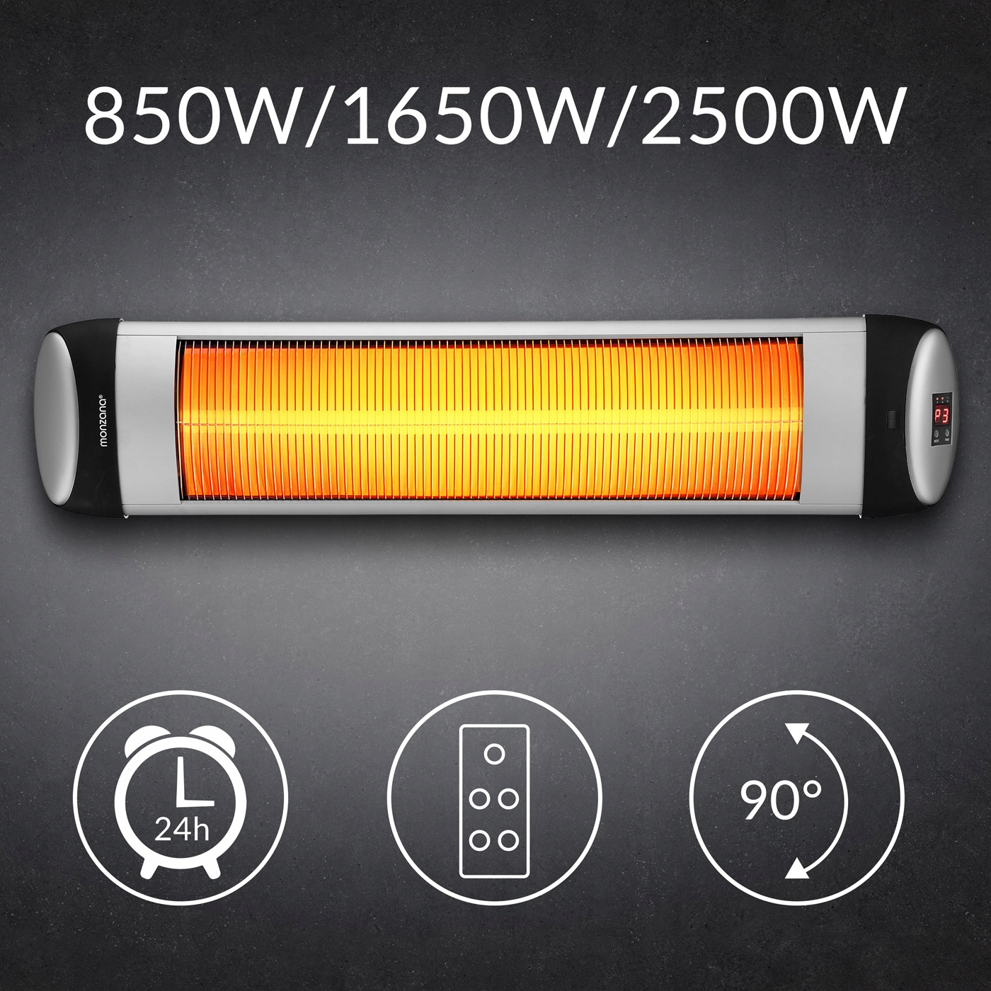 Nowoczesny promiennik o mocy 2500W firmy Monzana® pozwala skutecznie i szybko ogrzać zadaszoną powierzchnię zewnętrzną bez konieczności wstępnego podgrzewania.