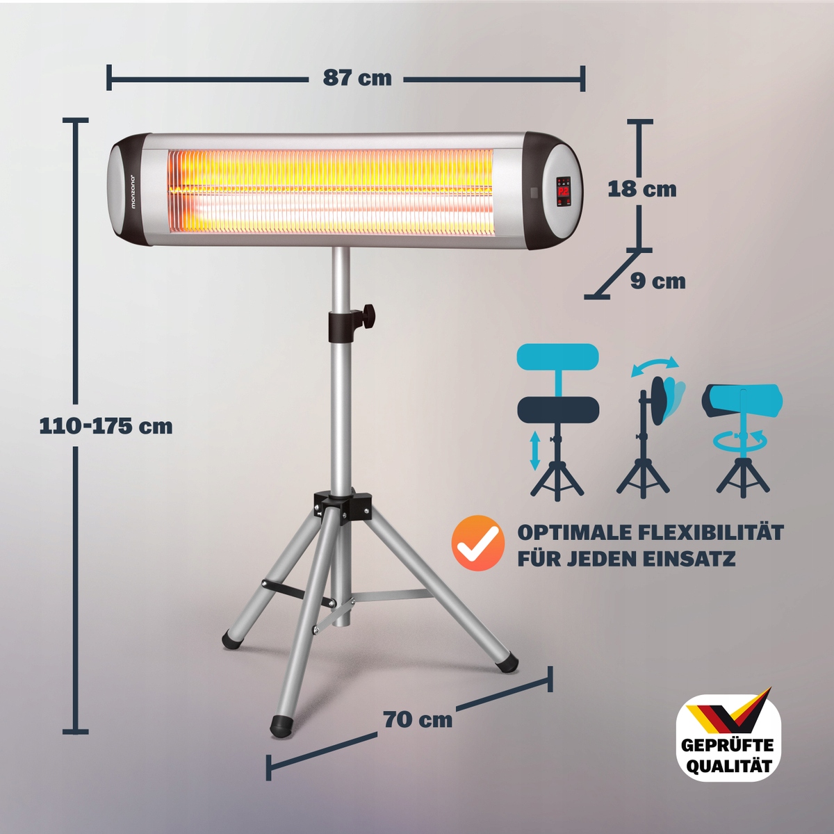 Wysokiej jakości stojak teleskopowy promiennika można ustawić inwidaulnie od  110-175cm.
