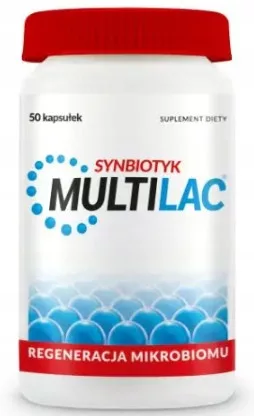 Multilac to suplement diety w kapsułkach, który zawiera w swoim składzie 9 starannie wyselekcjonowanych szczepów żywych bakterii probiotycznych. Związki te sprzyjają zachowaniu zdrowia w przewodzie pokarmowym, a dzięki zastosowaniu unikalnej technologii inkapsulacji cechuje je odporność na niskie pH soku żołądkowego oraz enzymy trawienne. Produkt nie zawiera mleka ani kazeiny, więc może być stosowany przez osoby uczulone na te składniki.