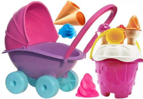 WÓZEK GONDOLA DLA LALEK + RÓŻOWE WIADERKO LODY Z FOREMKAMI WAFELKAMI