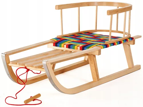 Drewniane sanki z oparciem oraz parcianym siedziskiem, dzięki któremu przyjemniej spędza się czas podczas jazdy na sankach. Parciane siedzisko zapewnia dodatkowy komfort, oraz sprawia że mniej odczuwa się chłód, oraz wyboje podczas jazdy.