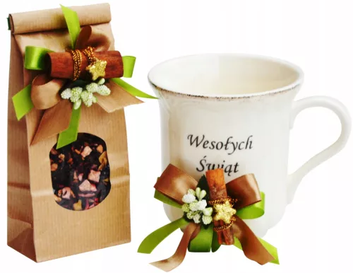 Piękny i praktyczny prezent na Święta Bożego Narodzenia - porcelanowy kubek i sypana herbata - całość pięknie ozdobiona i zapakowana. Doskonały prezent pod choinkę dla najbliższych.
