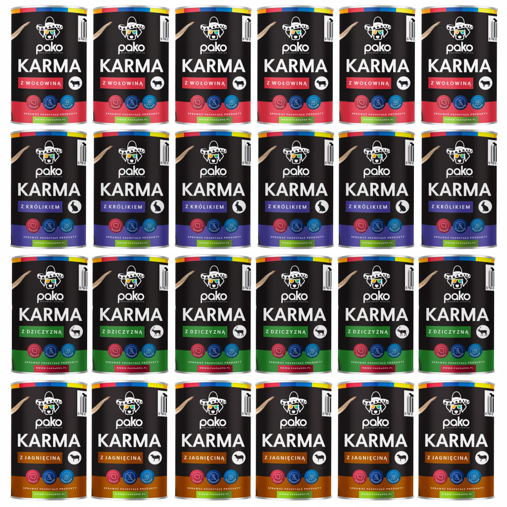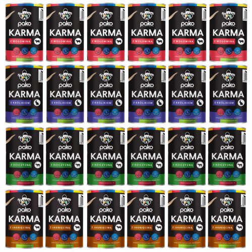 ✅ Zestaw PAKO składa się z 24 puszek mokrej karmy dla psów, które są sprzedawane