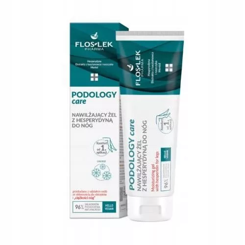 FLOS-LEK Podology Care Nawilżający żel z hesperydyną do codziennej pielęgnacji skóry nóg z uczuciem „ciężkości”, zmęczenia, rozszerzonymi naczynkami, zaczerwienieniami. Polecany szczególnie osobom wykonującym pracę stojącą, podróżującym, pozostającym długi czas w bezruchu, narażonym na występowanie efektu „ciężkich nóg”. Może być stosowany przez kobiety w ciąży.