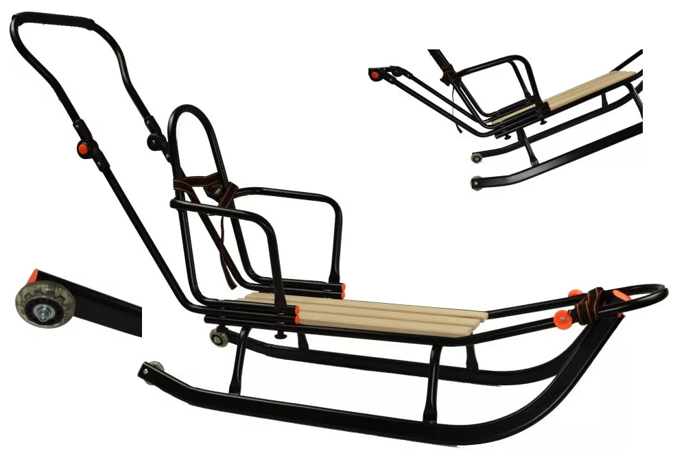 POLSKIE SUPER SANKI Z OPARCIEM, REGULOWANYM PROWADNIKIEM - PCHACZEM ORAZ KÓŁKAMI