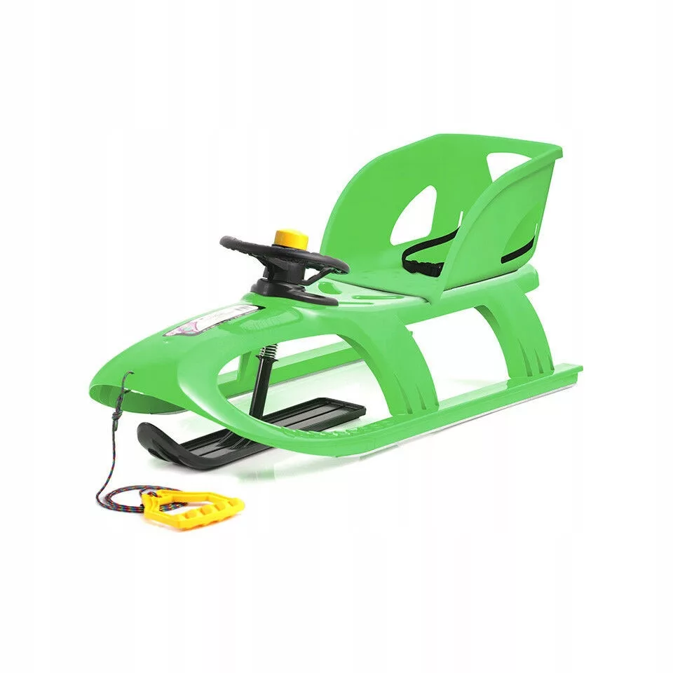 Schlitten mit Rückenlehne, Lenkrad, Kufe, Hupe + Sicherheitsgurt, grün