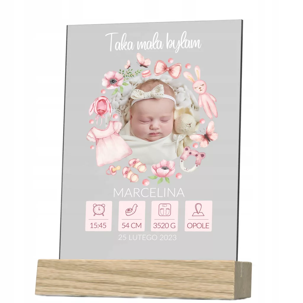 Personalizowana metryczka ze zdjęciem na szkle akrylowym - prezent na urodziny, chrzciny.