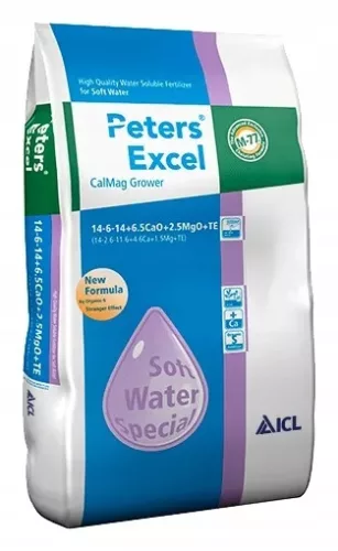 Peters Excel CalMag Grower jest przeznaczony do stosowania w miękkiej wodzie, szczególnie w fazie wzrostu wegetatywnego. Może być mieszany w jednym zbiorniku z saletrą wapniową. Specjalna formuła Organic-S podnosi stopień wykorzystania składników pokarmowych. Utrzymuje poziom EC na bezpiecznym dla roślin poziomie. Zapobiega wytrącaniu się osadów dzięki połączeniu wapnia i siarki. Wzmocniony efekt chelatowania mikroelementów i intensywniejszy wzrost systemu korzeniowego dzięki dodatku siarki. Wysoka zawartość schelatowanych mikroelementów gwarantuje intensywny kolor i prawidłowy wzrost. Maksymalna przyswajalność składników dzięki zastosowanej technologii M-77. Nawóz wpisuje się w ideę rozwiązań jednozbiornikowych.