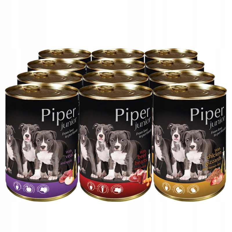Piper Junior to to karma specjanie opracowana dla szczeniąt, uwzględniając ich potrzeby żywieniowe.  Dokładnie opracowana recetura, duża zawartość białka i wszelkie niezbędne aminokwasy, gwarantują prawidłowy i zrównoważony  wzrost i rozwój młodych psów. Zawartość kwasów tłuszczowych z rodziny n-3 i n-6 wspierają metabolizm i regulują procesy zapalne i odpornościowe.