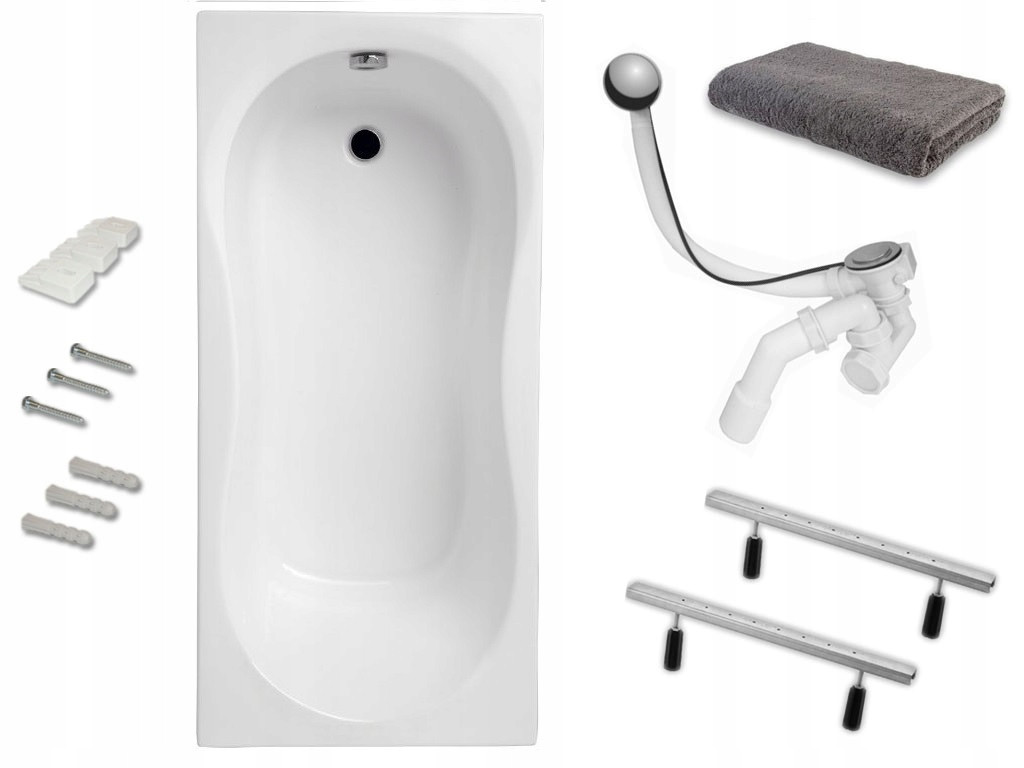 W skład zestawu wchodzi: wanna, wysokiej jakości syfon automatyczny, stelaż + nogi, uchwyty mocujące do ściany, ręcznik łazienkowy